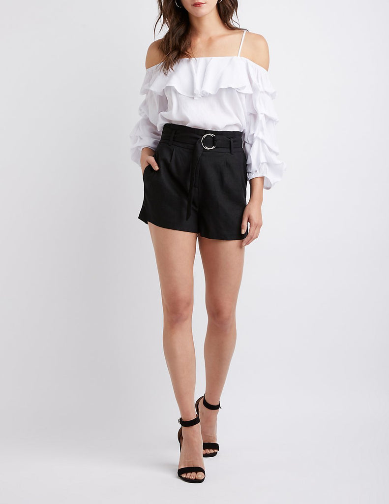 • Online only! Soft guazy woven fabric shapes a chic pair of shorts in an on-trend paperbag silhouette! This high-rise, cheeky shape features a sash belt at the waist and a concealed zip fly!